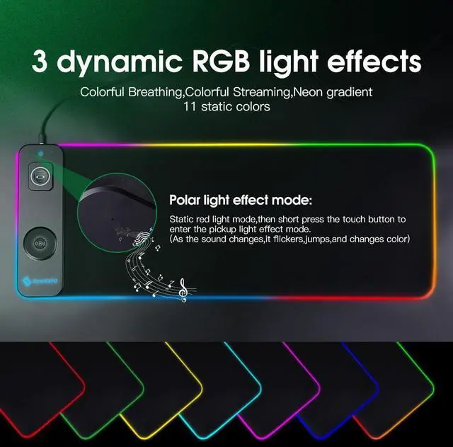 / 15 RGB light effect modes with sound pickup mode / - M15WR mouse pad has 15 different lighting modes with power-off or power failure memory function: 1 Polar light effect mode, 3 basic dynamic light effect modes and 11 static light modes (Red, Orange, Yellow, Grass Green, Green, Blue, Cyan, Purple, Peach Red, White, Pink). Press on touch button to switch among light effect modes and turn off/on light (Press and hold 3 seconds to turn off the light, single press to turn on or switch). When you play games our music, polar light effect could create an amazing ambiance for you (as the sound changes, it flickers, jumps and changes color).