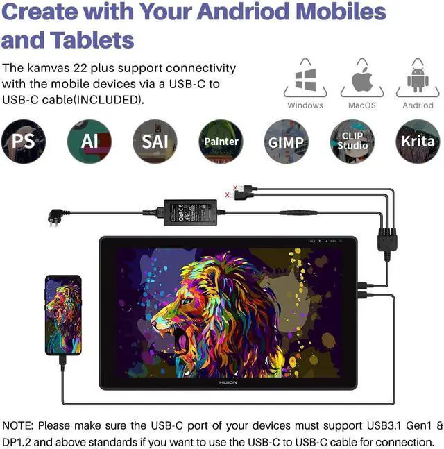 Mac/Windows/Android Supported: Kamvas 22 Plus pen display could work with Mac OS 10.12 or later and Windows computer 7 or later via a 3-in-1 Type-C cable, it also supports connection with Android mobile devices via a full-featured Type-C cable (INCLUDED). When a computer is not available, you still record your inspiration on our drawing display with your phones or tablets.