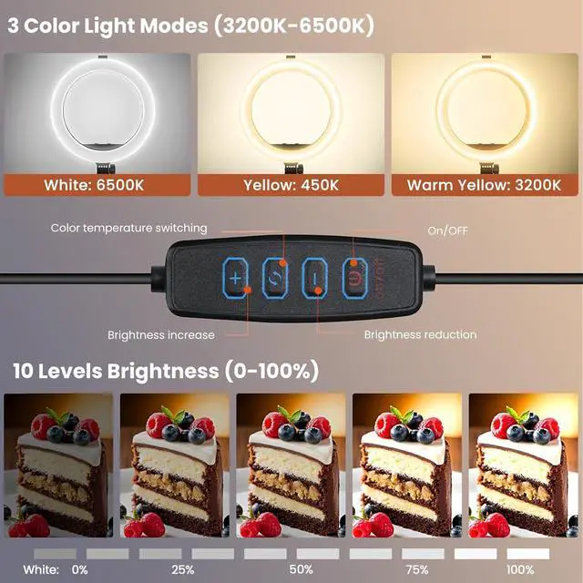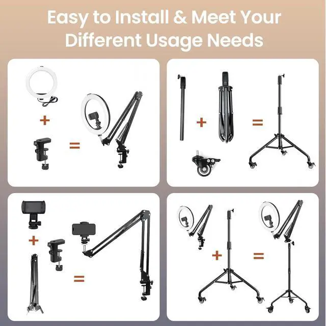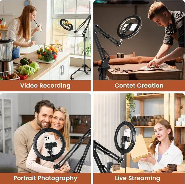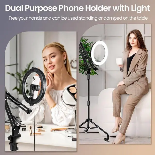 The phone recording stand with ring light is simple to install and easy to move, whether as a standing ring light or a ring light for desk, you can use this ring light in the kitchen, living room, bedroom, studio. This phone light for video recording can also be used for makeup, manicure, beauty, live streaming, online teaching and portrait photography, etc. It is an essential tool for YouTube, TikTok and content creation