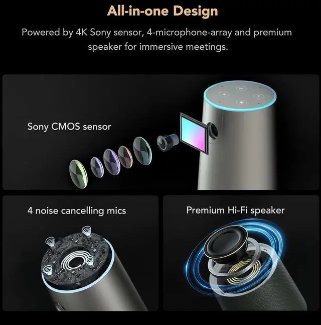 Easy Setup & Enterprise-Grade Privacy Protection: The computer camera is driver-free, offering a hassle-free plug-and-play experience with a single USB cable (a power adapter is provided for increased speaker volume). The remote control and top buttons provide convenient options to turn off the camera and mute the microphones. The round light ring displays the real-time status, ensuring user privacy is always under control.