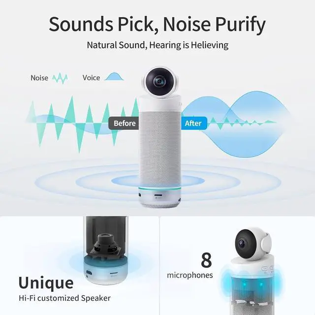 [Rich and Clear Audio] - Equipped with advanced 8*omni-directional microphone arrays, this meeting camera provides a 16 feet 360-degree audio pick-up range, with stronger echo cancellation and dereverberation ability. The premium Hi-Fi speaker ensures clear communication during meetings.