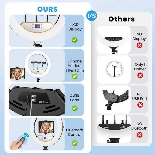 4x Clips + 2x USB PortsOur ring light with 3 phone clips, 1 ipad clip and 2 USB ports, enables you to live stream on various apps and charge your device at the same time.
