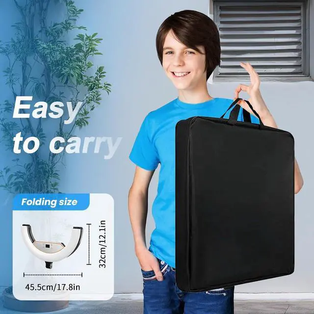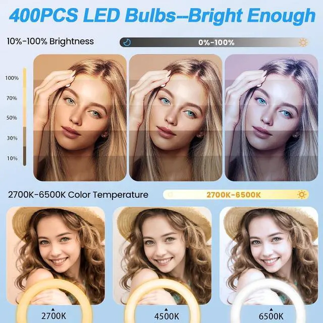 LCD Display & Dimmable Ring LightThis large tablet ring light compatible with iPad and iPhone, features an LCD display that intuitively shows brightness and color temperature, making it easier to adjust to the desired lighting mode. The 18-inch ring light with a stand offers adjustable brightness from 1% to 100%, and customizable color temperature ranging from warm yellow to cool white (3000K-4500K-6500K). It allows users to fine-tune the optimal lighting for various scenarios, making it ideal for portrait photography, live streaming, and outdoor work lighting. You can choose the appropriate size ring light, brightness and color temperature according to your needs.
