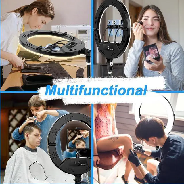 2USB Ports & Selfie ControlThe large iPad ring light also features 2 USB charging ports, specifically designed for long live streaming sessions, ensuring your devices never run out of power during work. To achieve the best lighting effects, our iPhone tripod with professional makeup tattoo light (aros de luz profesional) includes a remote control and a Bluetooth remote control CH-3, with a maximum range of 5 meters ( 16.4 feet). This professional ring light ensures you capture the best photos and videos at the perfect distance and brightness. It is ideal for live streaming, photography, hairdressing, makeup, and tattoo lighting.