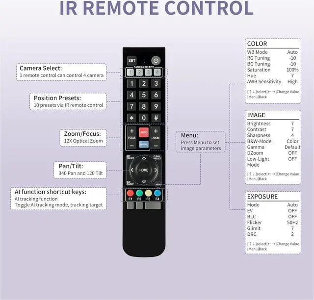 IR Remote ControlYou can use the hand-held remote and operate it by VISCA Pelco D/P controller keyboard to see everything in your workspace. Package Include1× Video Camera, 1× Remote Control, 1× USB 2.0 Cable, 1× RS232 Control Cable, 1× RS485 Terminal Block, 1× Power Adapter, 1× EU Standard Power Cable, 1× US Standard Power Cable, 1× Manual