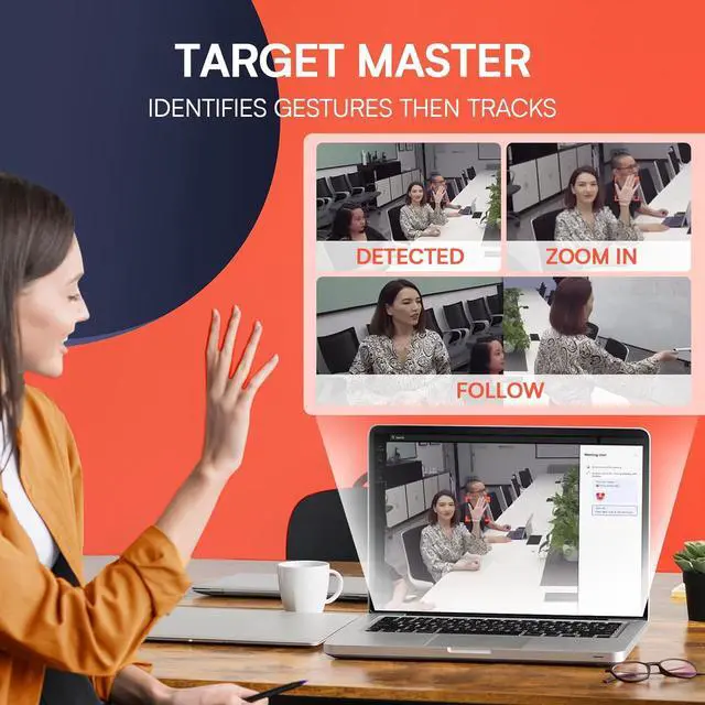 Video Conferencing CameraSmart Gesture-Control FocusJust raise your hand up, mini 4k webcam will quickly recognize your gesture and smoothly zoom in until the video is focused on you. In addition, the video image of the computer camera will follow as your move. AI Huddle mini conferencing camera achieves an intelligent focus on the speaker.