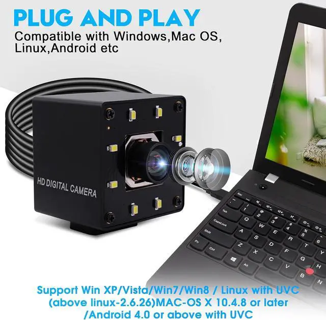 Plug&Play Webcam: Our computer webcam can plug and play very easily. With USB 2.0 connector, no need to download or install any complicated driver software, convenience and useful. super small outline and thin profile for embedded applications, Compact camera for all kinds of machine vision, Wide application for 3D scanner, VR camera, electronic microscope, medical machine, automated image acquisition system.