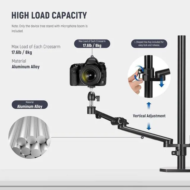 Laptop, Tablet & VESA Mount Included With a top ball head mount, 1/4" screw, VESA interface, and a mounting thread (only for the microphone arm) on boom arms, effortlessly mount laptops, tablets, phones holders, action camera mount adapters, LED lights or mics to the desk stand. Compatible with CM27 GL1 PRO/660 PRO II/RGB1200/A111 Canon Nikon Sony MacBook iPad Microsoft Snowball ICE Blue Yeti etc. The VESA mount adapter features a quick release button for easy detachment