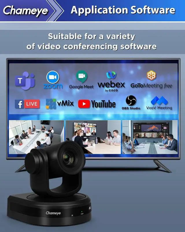 Multiple CompatibilityCompatible with Video Mixer Switcher and PTZ controller. Compatible with vMix/OBS, Zoom, Teams for business, Voov meeting, CISCO WebEx and other live video streaming software. Multi-cameras video production for live streaming to YouTube and Facebook. Support VISCA, PELCO P/D and other protocols.