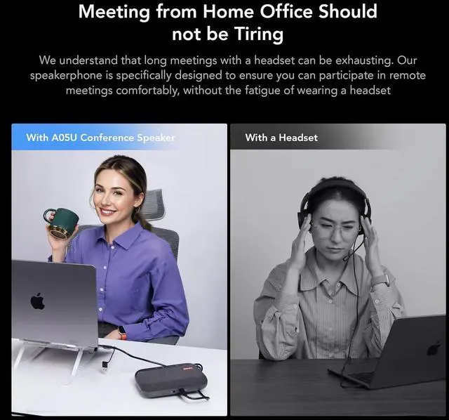 Meeting from Home Office Should not be TiringWe understand that long meetings with a headset can be exhausting. Our speakerphone is specifically designed to ensure you can participate in remote meetings comfortably, without the fatigue of wearing a headset.