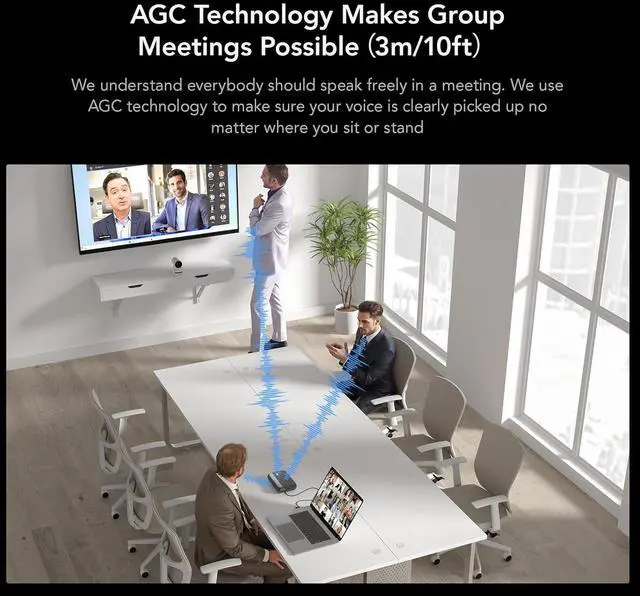 Full Duplex & Automatic Gain Control: Full duplex audio processing technology allows multiple people to talk at the same time without missing a word. With the help of AGC technology, the volume of the voices within 3m/10ft can be adjusted automatically so the voices of all conference participants can even be understood equally well, even if they sit at different distances and speak at different volumes.