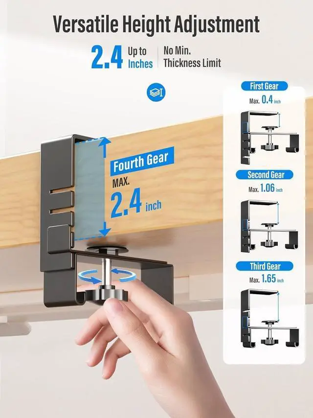 Multi-Surface MountingFeaturing a 4-position adjustable clamp (fits up to 2.4" thick), our cable tray perfectly fits any desk - whether metal, wood, or glass. Each position securely locks in place. Non-Slip Rubber PadsPrevent desktop scratches, ensure stability and firmness.