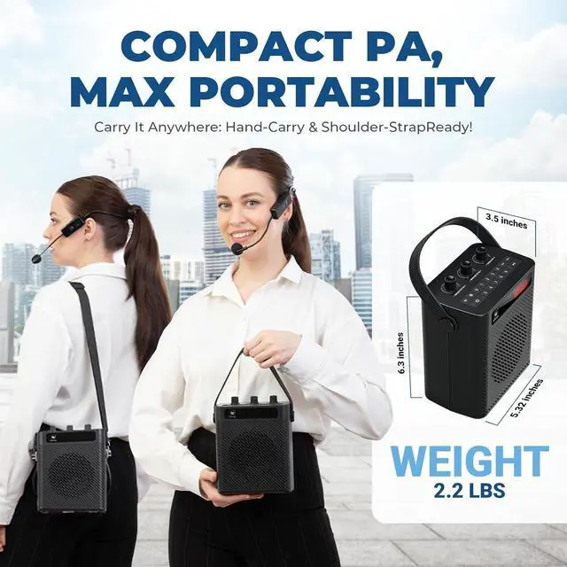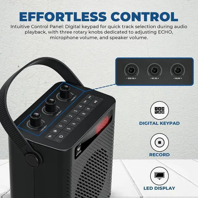 User-Friendly Operation -- The S93 portable pa system features a UHF wireless headset mic for easy one-touch pairing and crystal-clear audio. Wear it on your head, neck, or hold it for ultimate flexibility. With three adjustable knobs, you can independently control echo, microphone volume, and speaker volume for a customized sound experience. The digital keypad allows quick song switching during audio playback, while the instant recording feature lets you capture every moment with ease.