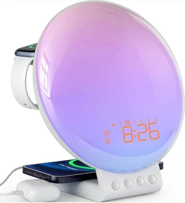 More Than an Alarm: The 3-in-1 wireless charger sunrise alarm clock is not only an alarm clock but also an atmosphere light. With 11 color options and 20 brightness levels, this light alarm clock sunrise is also your go-to night light or sunset lamp. Use it during bedtime reading, evening relaxation, or even as a calming nursery light.