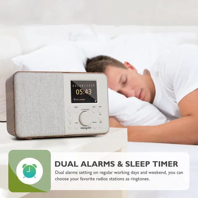 DUAL Alarms and Sleep Timer- Dual alarms clock settings and duration settings to week up you in working day and weekend day, you can choose your favorite radio stations as ringtones. You can set a sleep timer of up to OFF/15/30/45/60 minutes before going to sleep, and it will automatically turn off the radio when the time is up.