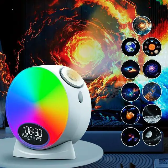 Timer & Alarm Clock & White NoiseMulti functional wake-up light, you can set the starry sky projection light to turn off within 1 or 2 hours. If you forget to set the timer, it will automatically turn off after 4 hours, but you can turn it back on if you want to continue using it. This starry sky lamp also has 15 types of white noise, you will sleep better with the relaxing white noise music. It can also be used as an alarm clock, you can set two alarms. The display screen of Star Projector will show the alarm clock, time, and weather.