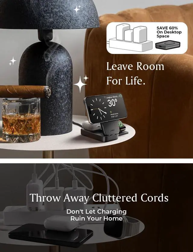 Apple Family Travel Essentials: A one-stop iOS Standby wireless charging solution for your iPhone, Apple Watch, and AirPods. A great option to organize your home, office, travel, hotel, or meeting room. It lets you say goodbye to tangled cords and messy cables, keeping your space neat and organized, making it a convenient charging solution for your busy lifestyle