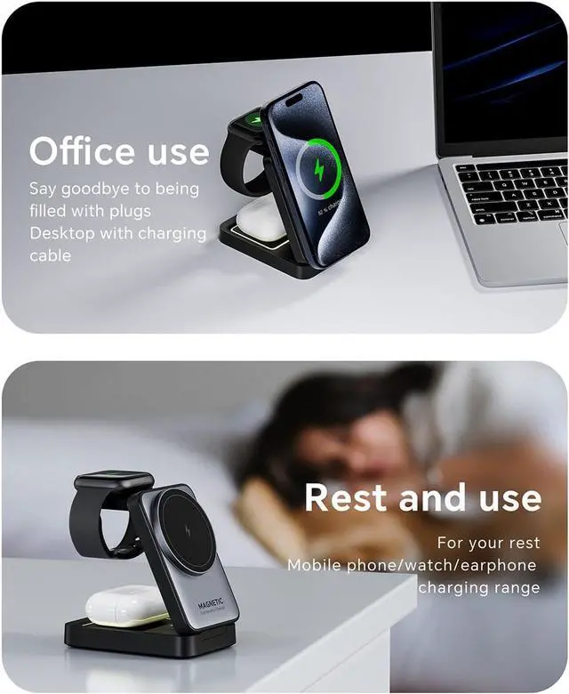 Upgrade Powerful Mag-Safe Charger StandMag-Safe charger 3 in 1 makes fast charging safe and easy. The built-in super strong magnet makes alignment instantly and precisely, just 1 second to achieve lightning fast wireless charging. The magnetic charger can hold your iPhone horizontally and vertically, or in any directions, the phone charging area can adjust the angle up and down by 120°, you can enjoy all your comfortable viewing from any angle.