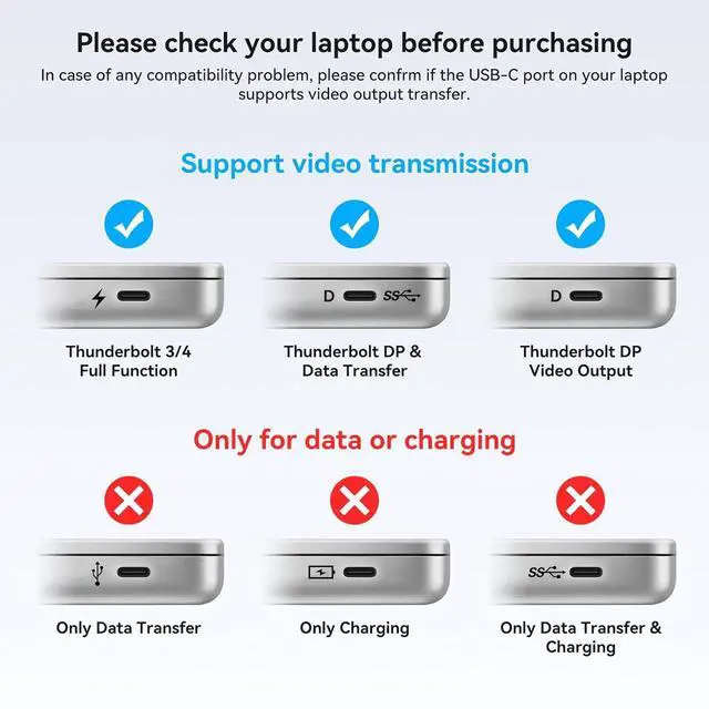 Note: USB-C port connects to USB-C drive for data transfer only, cannot output video. Does not support the use of high power USB devices (e. g. hard drives, SSDs, etc). Please use the included USB-C cable; if the cable is too long, it may cause signal distortion or repeated input