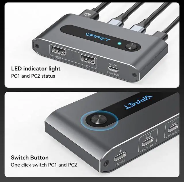 Switch Easily & 100W PD Fast ChargingThis USB Type-C KVM switcher support physical button control (no remote switching), you can select the computer to display by pressing the button on KVM switches. LED indicator will indicate the running computer. Designed with PD charging port to give enough power for your laptop during using. This is a very stable HDMI KVM switch.