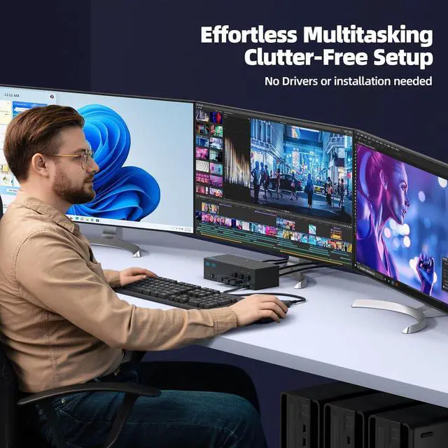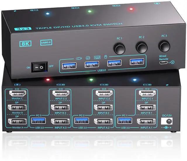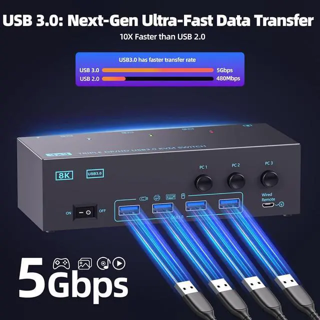 Support High Resolution and HighRefresh Rate Triple monitor KVM switch supports up to 8K@60Hz/30H, 4K@144Hz/120Hz (HDMI port supports 8K@60Hz/4K@120Hz, DP port supports 8K@30Hz/4K@120Hz).