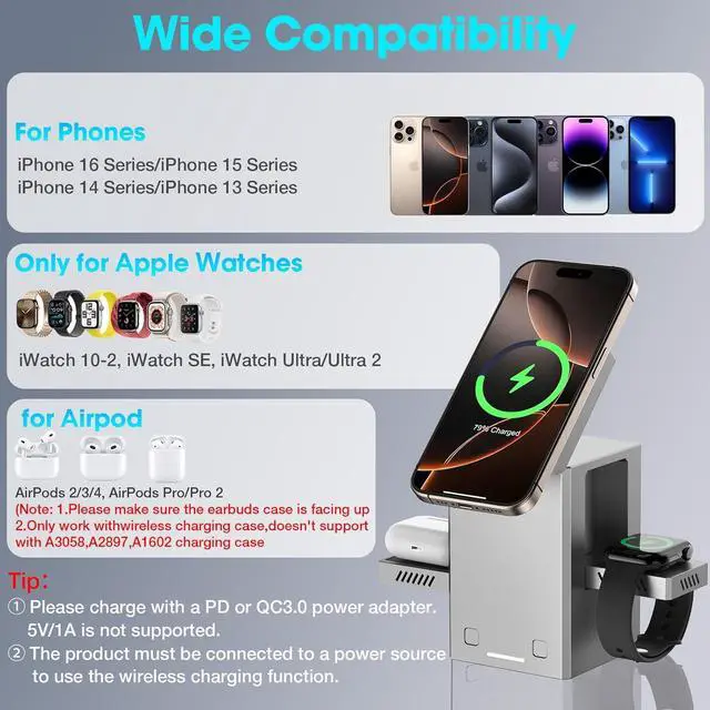 [Broad Compatibility] Equipped with a 25W charging adapter, this charging station can charge your iPhone and apple devices with the fastest speed. Compatible with iPhone 16/15/14/13/12 Pro Max/Pro/Plus/Mini; compatible with Apple Watch 10/9/8/7/6/5/4/3/2/Ultra/Ultra 2/SE; compatible with