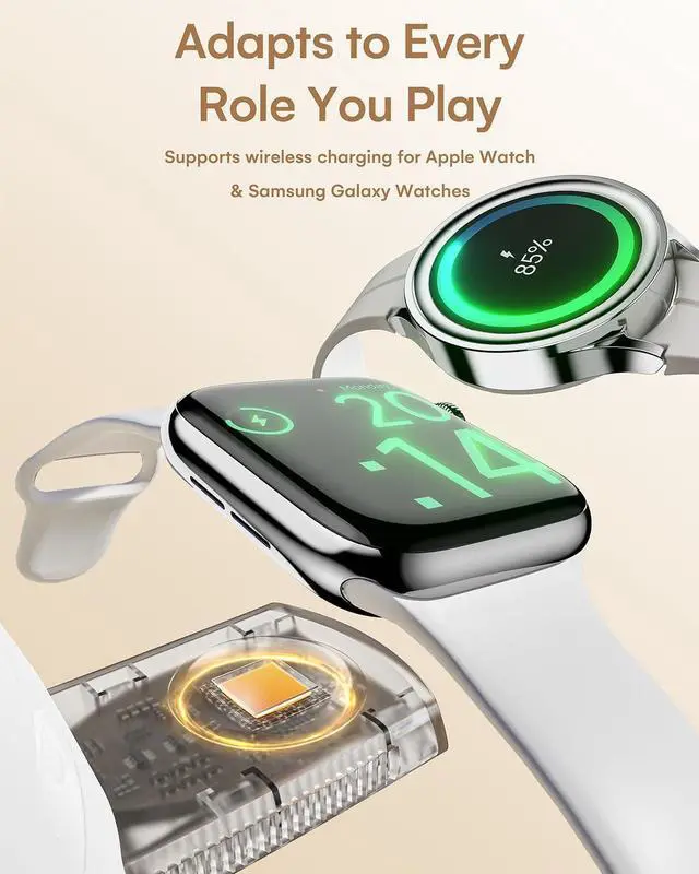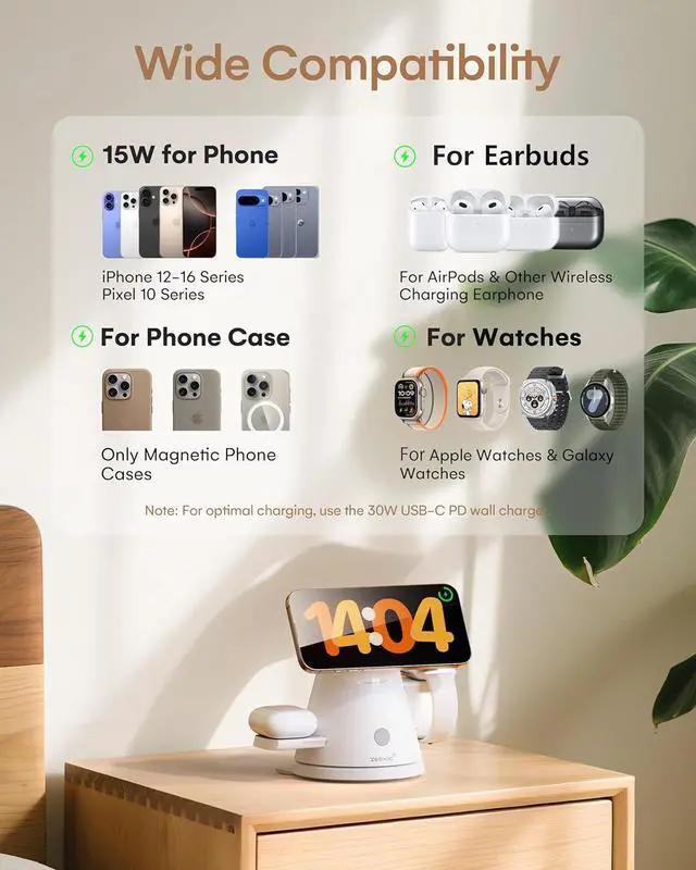 Flexible Charging: Smooth-swivel base rotates freely for multi-device access from any direction. Adjust the Mag-Safe phone stand up/down to portrait or landscape mode for FaceTime, streaming, or desk use. Non-slip silicone suction base keeps devices secure. Compact layout fits nightstands, offices, or kitchen counters.
