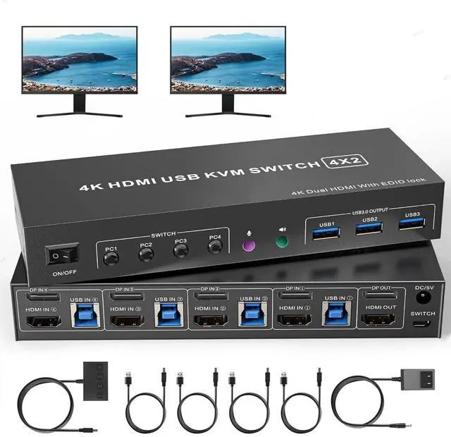 Great Compatibility & 2 Switching ModeThis 2 monitor hdmi displayport kvm switch driver-free for Windows, Mac OS, Linux and Chrome OS. Compatible with PC, Laptop, TV Box. It is widely applied for home, office, teaching, games, etc. You can press the button on the panel or use the wired remoteincluded to switch the computersLED indicate the active computer