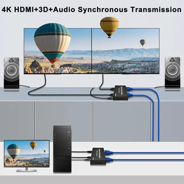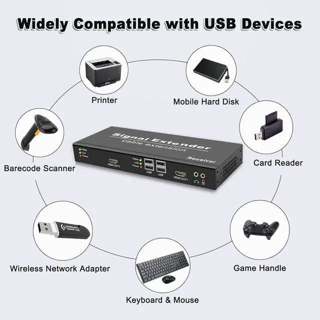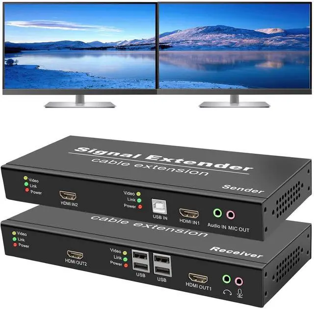Powerful 4K HDMI KVM Extender - 2 Ports HDMI, 4 Ports USB 2.0 This HDMI KVM extender kit can extend 2-channel 4K HDMI signal, 1-channel independent audio, 1-channel microphone, 4-channel USB to the remote end through two Ethernet CAT5e/6/7 cables. Plug and play installation makes setup a breeze with no need for additional drivers.