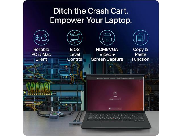 NO CONFIG HASSLES. Easily connect the portable crash cart and control any server from your laptop without installing drivers or software on the target server: works for MacOS (Sonoma and beyond) and Windows (Windows 10 and beyond)
