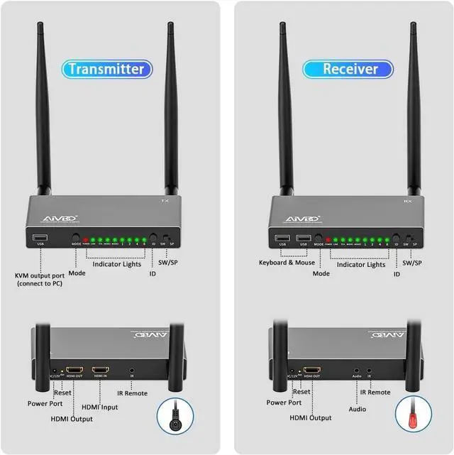 Convenient KVM Function & IR Remote ControlThe wireless HDMI receiver comes with KVM functionality. Simply plug a keyboard and mouse into the 2 USB ports to control your source device remotely. The IR remote control feature lets you change channels, pause your movie, control your Blu-ray player, or adjust your set-top box settings without leaving your seateven if the devices are located in another room. Enjoy uninterrupted access to your favorite apps like Neflix, Hulu, and YouTube, all from the comfort of your seat