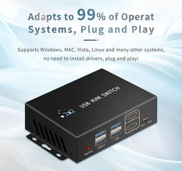 Wide operating system compatibility The KVM switch is compatible with W 7/8/10/11P, Linux, Ma and other systems. It also supports a variety of input and display devices. It is important to note that KVM is just a switch and requires the host computer and monitor to support the appropriate settings in order to be realized!
