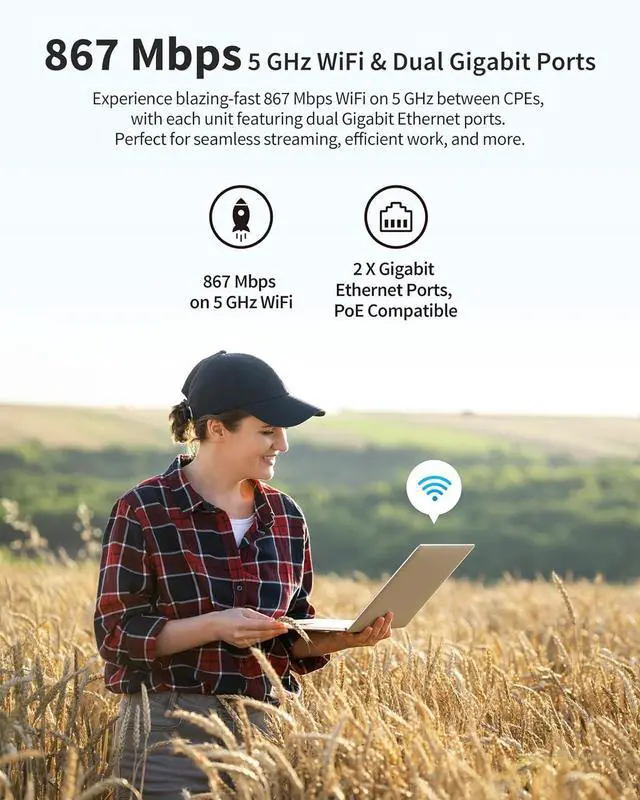 Installation Requirement: For optimal performance, a clear line of sight between the two CPEs is required. Obstacles like trees, buildings, and large steel structures can block the wireless signal