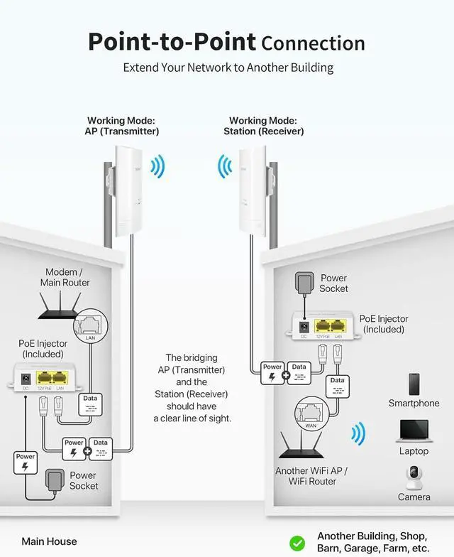 Plug-and-Play: The WiFi bridge comes pre-paired for a hassle-free setup. Simply power the AP and Station in the same room for automatic pairing in minutes. Supports both wall and pole-mounted installations for flexible deployment