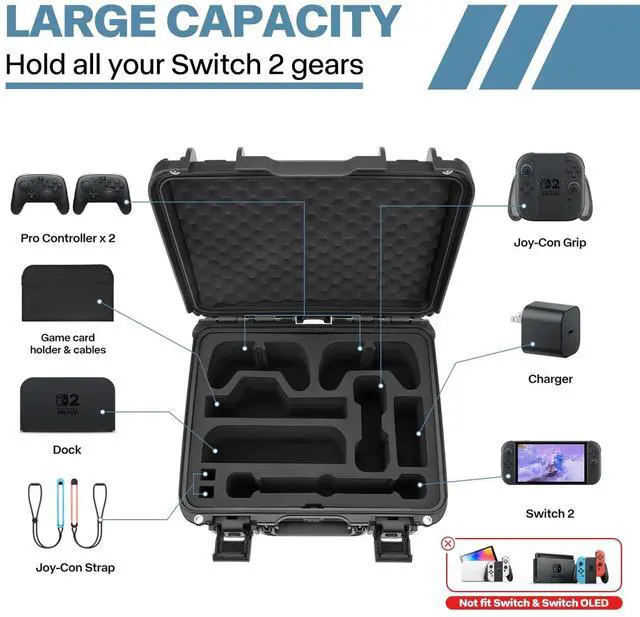 Precision-Fit Molded Interior The die-cut interior EVA foam layer provides exact fit for the Switch 2 and accessories, hold your game gears in place securely. The high-dense EVA can provide all-round cushion while traveling or storing.