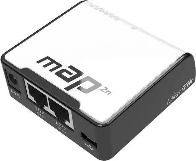 Wireless Dual-Chain 2.4GH z Micro Access Point The mAP (micro Access Point) also known as RBmAP2nD is a tiny size wireless Dual-Chain 2.4GH z Access Point with full RouterOS capabilities. It is very portable, since it accepts power from a wide variety of sources - USB, Passive PoE and power jack. It also works as a PoE injector - the second Ethernet port provides up to 500mA of power to another device, for example, you can connect a SXT CPE device to it.