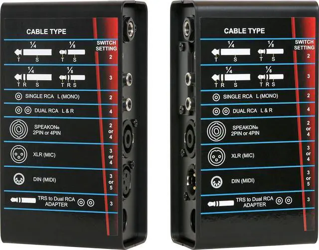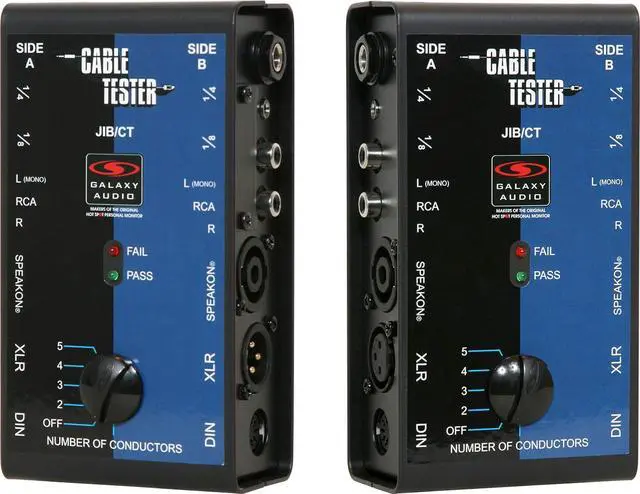 Cable tester (JIB/CT) was designed to test cables quickly and simply. The CT tests 6 different types of cables, XLR, 1/4", RCA, 1/8", speaker, and DIN (MIDI). the CT features a specially designed microprocessor, which tests a cable 200 times per second. (A simple 'pass/fail' Indicator lights up when you plug Each side of the cable into the CT and select the number of Conductors of the cable. ) great for use in churches, schools, and bands.