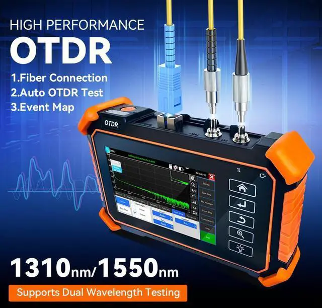 4 inches Intelligent and Multi-functional Fiber Optic Testercontaining expert OTDR, automatic OTDR, event map, 10G split-wave power meter, general optical power, end state verification, multi-core test, intelligent line diagnosis (optional), loss test, RJ45 line length/line sequence/seeking line, red light, stable light source, illumination. Touch screen and button double design, simple operation, friendly interface, is the optical cable construction installation, engineering acceptance and on-site repair of the right hand.