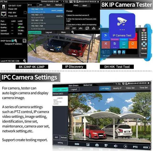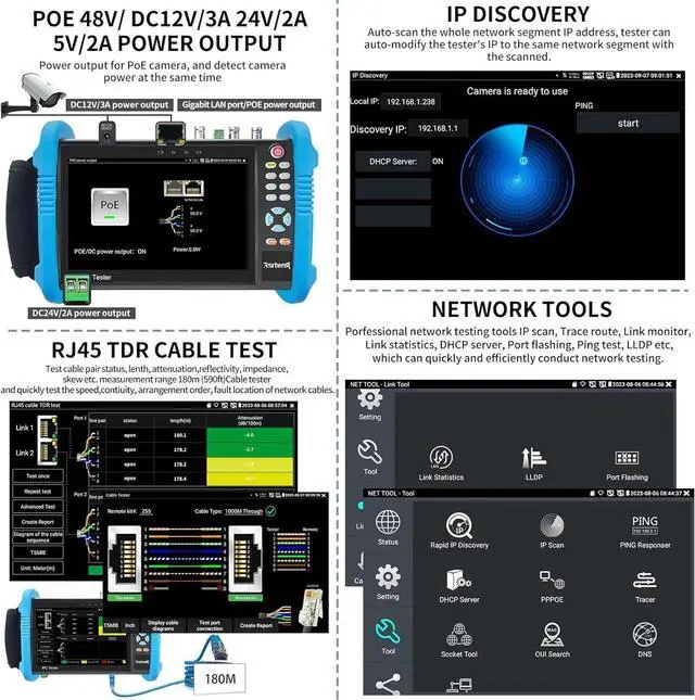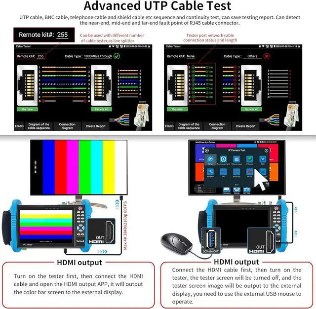 More parameters Camera Tester7 inch IPS touch screen, 1920*1200 resolution. Dual Ethernet port 10/100/1000Mbps, Support RS485, Audio I/O, HDMI output, WiFi, DC