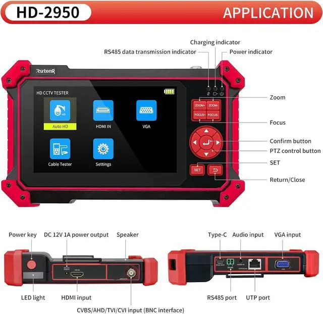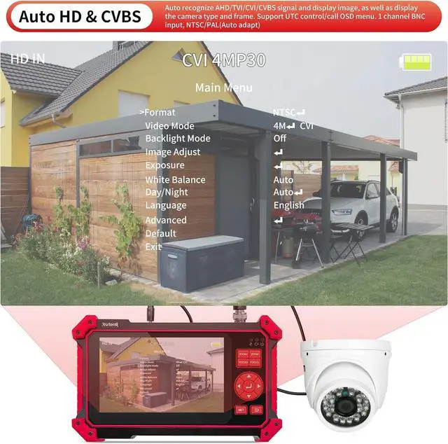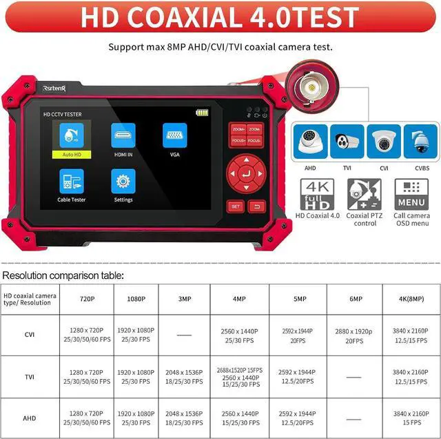 Auto HD TVI/CVI/AHD/CVBS Coaxial Camera Tester 5 inch TFT-LCD screen HD CCTV tester is designed for maintenance and installation of HD coaxial cameras. Easy to carry.