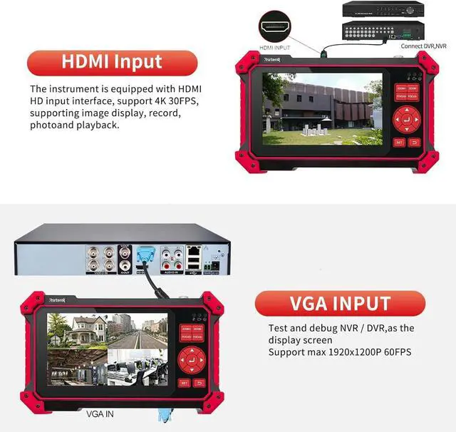 VGA input & HD input1 channel HD signal input and 1 channel VGA vedio signal input, HD input support max 4K 30FPS. VGA support max 1920×1200P 60FPS. Tester will as a display. Tester Dimension/Net weight 7.2 x 4.3 x 1.6 inch/ 0.4 kg( 0.88 lbs).