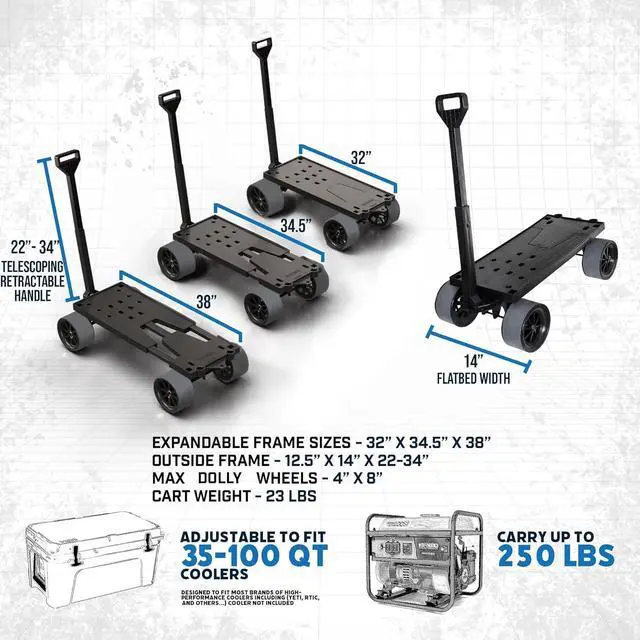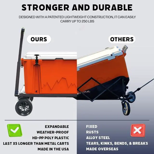 A versatile and sturdy cooler carrier that offers ample easy portability for your coolers, for outdoor gatherings, events, and camping trips.