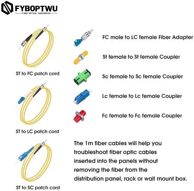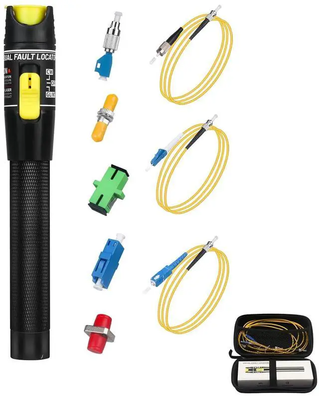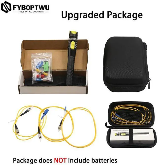 ComponentsIncludes 5 Adapters - FC, ST, LC, SC couplers ( female to female) and FC male to LC female adapter; 3 short Patch Cords ( 3.2 FT Long) - ST to SC, ST to LC and ST to FC patch cord. These components facilitate the troubleshooting of fiber optic cables connected to distribution panels without the need to remove the fiber from the panel. [Note: Not include 2AA batteries]
