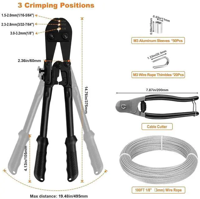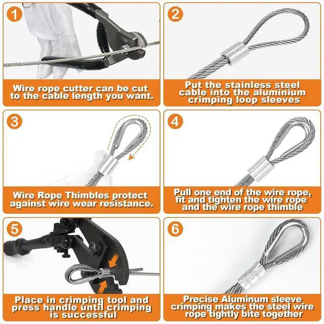 Install: This kit comes with everything you need to get started right away, offering both convenience and durability. Cutting the wire to your desired length is a breeze with the included cable cutter, then fix it with aluminum crimping loops and thimbles(tip: remove the coating on the crimping point for a secure fit)