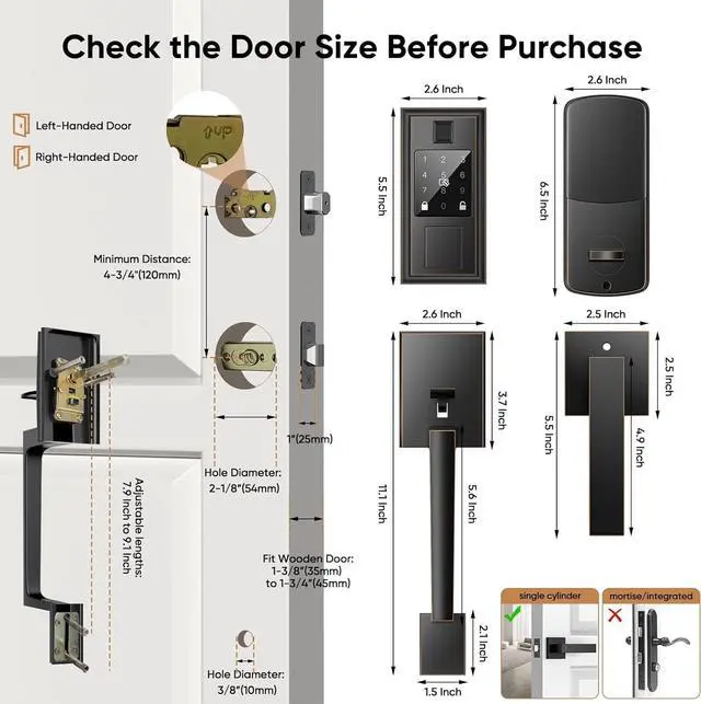 US standard wooden doors (thickness: 1-3/8" to 1-3/4"), this zinc alloy smart lock is built to last. Whether you're upgrading your front door lock set or installing a new exterior door lock, our easy-to-install smart locks ensures a hassle-free experience. Be sure to watch the installation video and read the manual before starting.