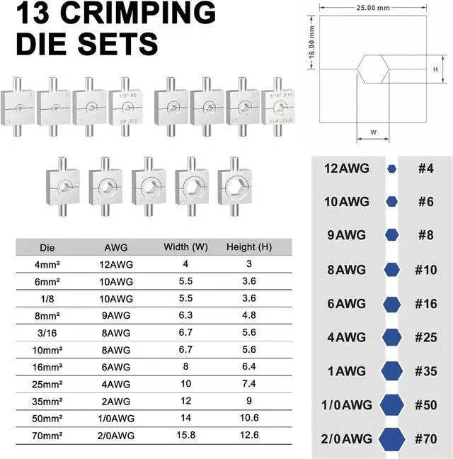 13 Crimping Die SetsHydraulic crimping tool comes with crimping dies for 1/8", 3/16", 12 AWG, 10 AWG, 9 AWG, 8 AWG, 6 AWG, 4 AWG, 2 AWG, 1 AWG and 2/0 AWG cables and creates a strong, hexagonal crimp for a clean, efficient look for your projects. 1/8" and 3/16" hydraulic crimping dies fit for 1/8" to 3/16" cable railing kits.