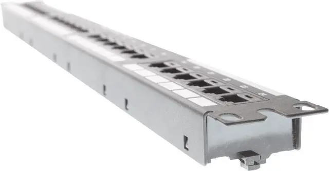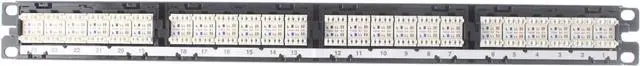 24-Port, Category 6, patch panel with 24 RJ45, 8-Position, 8-wire ports. Exceed ANSI/TIA-568-C. 2 Category 6 and ISO 11801 2nd Edition Class E standards. Meet requirements of IEEE 802.3 af and IEEE 802.3 at for Poe applications. Each port is 100% tested to ensure NEXT and RL performance and is individually serialized to support traceability. Utilize 110 punch down termination on back panel and includes retention cap for each port. Each port contains a universal label that is color-coded for T568A and T568B wiring schemes. Angled versions allow for higher density applications by easily routing the patch cords to each side of the panel eliminating the need for horizontal cable management.