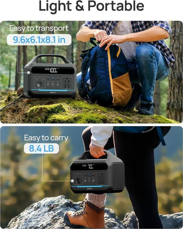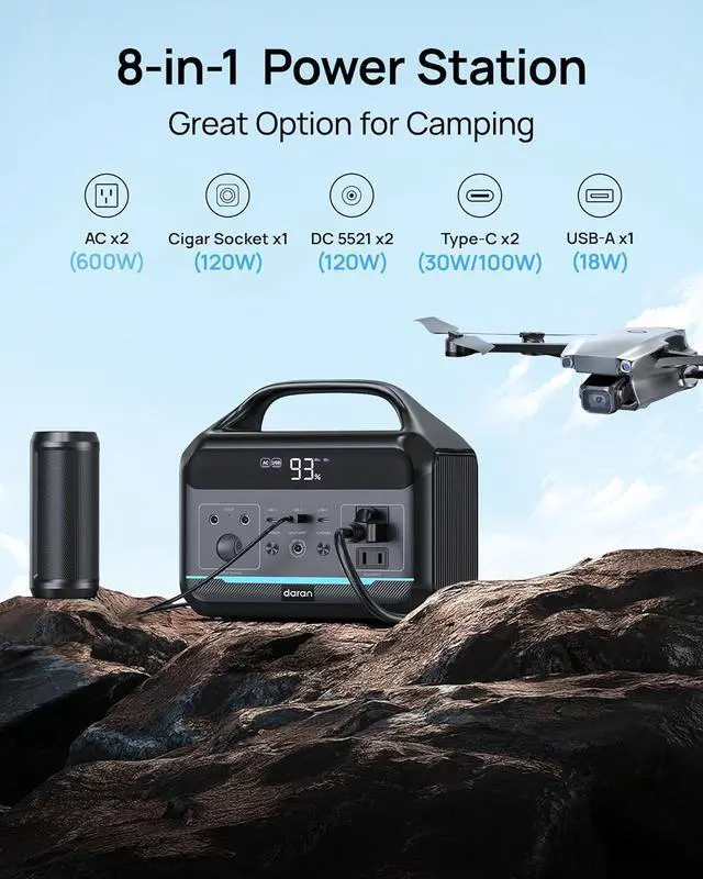 VERSATILE 6-PORT DESIGN & EMERGENCY READY Features 6 ports including 2x AC outlets (600W, 1200W Surge), 1x USB-C PD60W, 2x USB-A (18W), plus DC input/output. Simultaneously charge multiple devices like laptops, phones, lights, mini-fridges, and drones (Only suitable for powering devices within 600W)..
