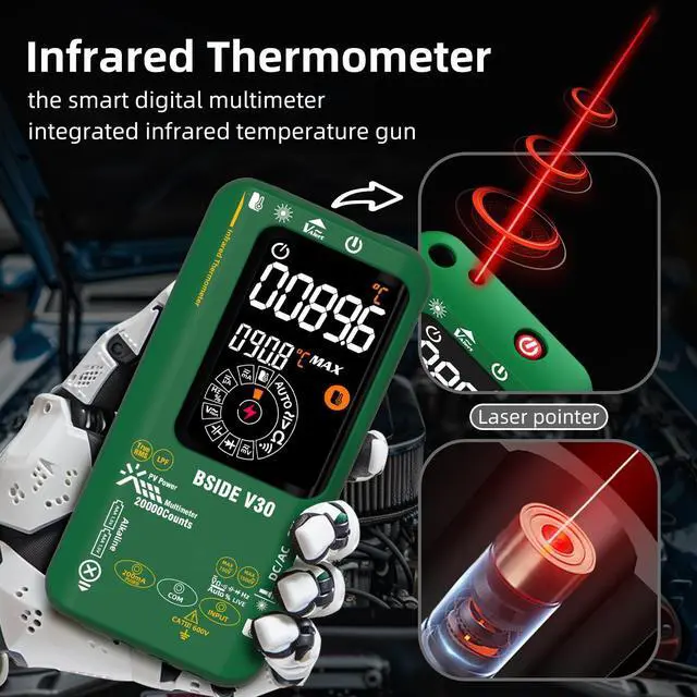 Measurement of AC and DC current, AC and DC voltage, resistance, diode, on-off, frequency, duty cycle, non-contact infrared temperature measurement, laser level indicator, high-voltage diodes, voltage regulators, light-emitting diodes