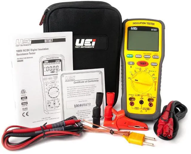 Complete Kit The IRT807 comes with everything you need. The insulation test kit includes Silicone test leads with alligator clips, insulation test probe with alligator clips, a K-Type thermocouple, a soft carrying case, and 4 AA batteries